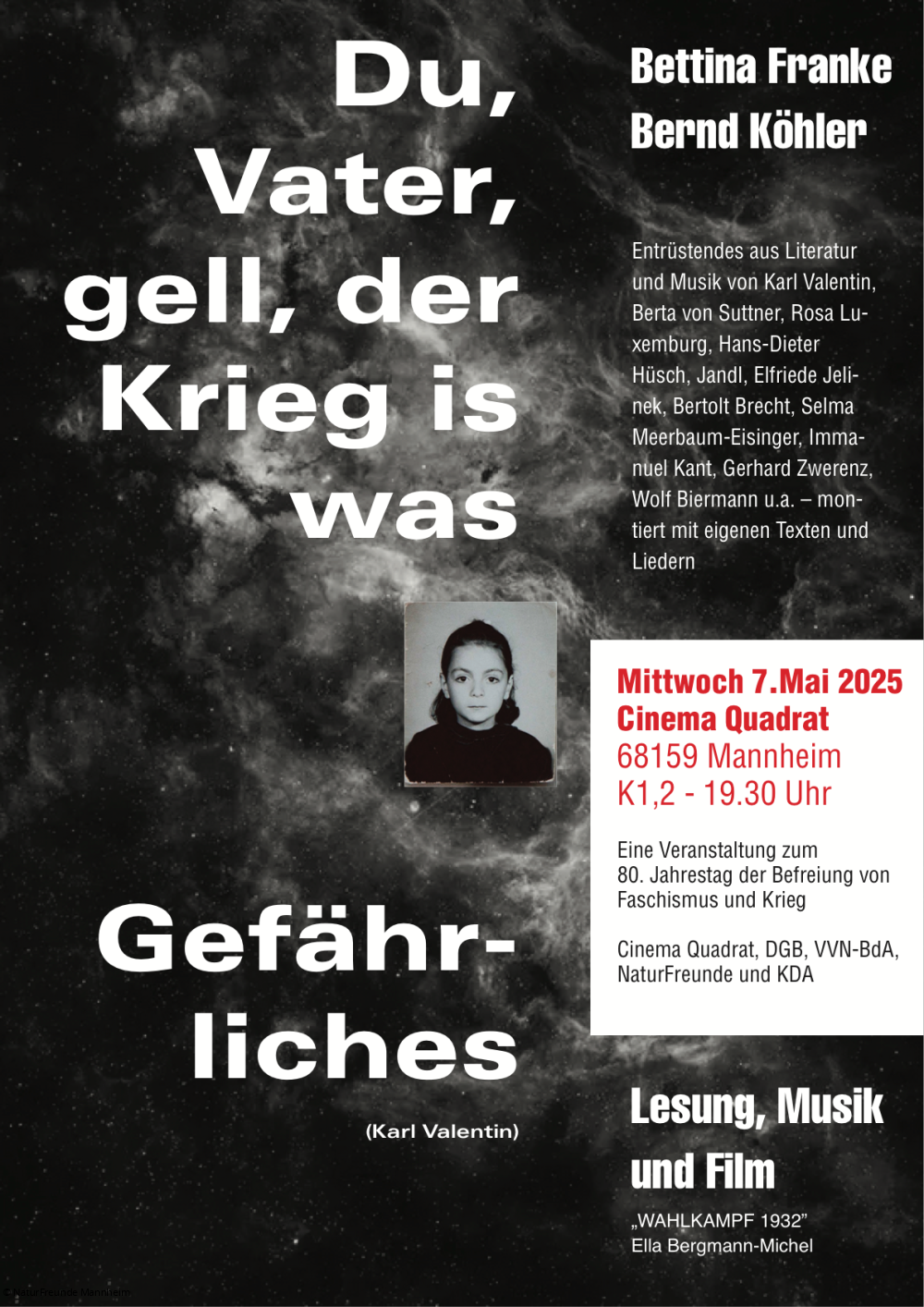 Zum 80-jährigen Erinnern an die Befreiung von Krieg und Faschismus widmen sich die Schauspielerin Bettina Franke und der Liedermacher Bernd Köhler dem großen Thema der Menschheitsgeschichte mit Texten, Gedichten und Songs aus mehreren Jahrhunderten, montiert mit eigenen Liedern und Texten.