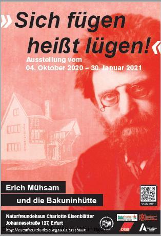 Im Erfurter Naturfreundehaus Charlotte Eisenblätter kann seit dem 4. Oktober eine kulturhistorische Ausstellung besucht werden: Unter dem Titel "Sich fügen heißt lügen – Erich Mühsam und die Bakuninhütte" widmet sie sich der Geschichte der anarchistischen Gewerkschaftsbewegung in Thüringen und einer ihrer berühmtesten Stätten, der Bakuninhütte in Meiningen.