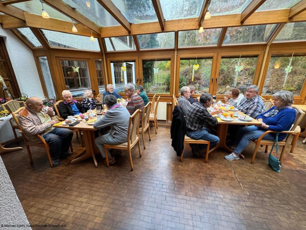 Nach der herzlichen Begrüßung im Naturfreundehaus hatten aller Hunger und es gab genügend Pfälzer Spezialitäten, so dass jede*r schnell etwas zum Essen gefunden hatte. Am Nachmittag machten wir noch einen kleinen Sparziergang rund ums Haus. Bei einem geselligen Abend und den vielen Erlebnissen des letzten Jahres hatten wir uns bis spät in den Abend viel zu erzählen.