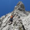 Am Sonntag kletterten wir nach einem Sportkletter-Warm-up mit unserem Ausbildungsduo Sandra, Sepp (Josef Hümmer) und drei weiteren Aspiranten in Zweier- und Dreierseilschaft durch die Route Südwind. Das direkte Feedback zu Seilhandling, Standplatzaufbau, Absicherung war perfekt und konnte von Seillänge zu Seillänge direkt angewendet und verbessert werden. Nach einem erfolgreichen Tag mit italienischem Ausklang wurden die kommenden Tage besprochen. Es wurde ein langer Abend mit Routen skizzieren und Rucksack packen. Am Montag ging es von Mittenwald auf die Dammkarhütte und nach kurzer Rast via MaMa-Kante auf die Kreuzwand. Eine sehr schöne alpine Tour mit nicht ganz einfacher Routenfindung und wildem Abstieg.