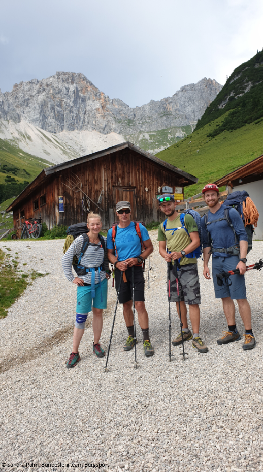 Am 8. August ging es für Lukas und mich zur einwöchigen Prüfungswoche für den Lehrgang Trainer*in B - Alpinklettern nach Leutasch in Tirol. Unsere Ausbildungsleiterin Sandra Palm präsentierte uns nachmittags zunächst einen Wochen- und Themenüberblick. Im nahegelegenen Klettergarten wurden wir dann auf Sicherungstechnik, Knotenkunde und Kletterkönnen „geprüft“, um die Seilschaften für die geplanten Mehrseillängen in Nösslach (Ötztal) im Sektor Sonnenblume zu bilden.