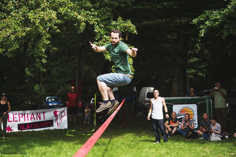 Wir vom Landesverband der Naturfreundejugend Nordrhein-Westfalen haben im Juni dieses Jahres schon zum dritten Mal das „Slacklinefestival NRW” veranstaltet. An zwei Tagen haben wir auf der Wiese und im Wald um das Naturfreundehaus Ebberg unterschiedliche Workshops rund um das Thema Slackline angeboten: Slacklinen zum Kennenlernen, High-Lining (also sehr hohes Slacklining mit Sicherung), Fortgeschrittenen-Workshops (Longline und Trickline) und auch akrobatisches Yoga für alle Erfahrungsstufen.